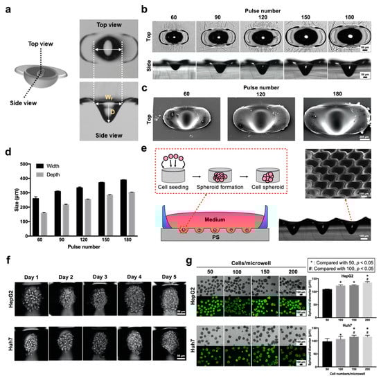 Characterization of polystyrene (PS) microwells made with different pulse numbers and multicellular tumor spheroid (MCTS) formation. (a) Illustration of ablated microwells from top and side views. (b) Top and side views of a single microwell with respect to pulse numbers ranging from 60 to 180. (c) A detailed surface profile of a single microwell recorded by SEM. (d) Evaluation of the widths and depths of microwells made with different pulse numbers. (e) Schematic diagram of spheroid formation within microwells, and a detailed profile of the microwell arrangement for spheroid formation by SEM. (f) MCTSs are directly shown from day 1, the day of cell seeding, to day 5 within the microwell. (g) Brightfield (gray) and fluorescent (live (green) /dead (red) staining) images of MCTSs with different cell number aggregates (50, 100, 150, 200 cells microwell−1) (left), followed by the quantification of spheroid size with respect to the cell seeding number (per microwells) (right).