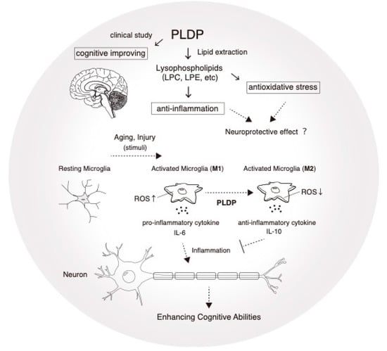 A potential role in the mechanism of action of PLDP in microglial cells. Our previous study suggested that PLDP improve cognitive function at older ages [], by acting as a rich source of lysophospholipids (LPLs). Total phospholipids were extracted from PLDP using the Bligh and Dyer method, an analysis of the composition of total phospholipids from PLDP revealed that the most abundant LPLs was LPC and LPE. We measured LPS-mediated anti-inflammatoly cytokines expression and ROS production with or without PLDP-derived LPLs treatment, IL-6 expression and ROS production was decreased.Conversion to the activated microglial phenotype (M1 and M2) is often accompanied by the release of NO and reactive oxygen species (ROS), along with the production of inflammatory cytokines such as IL-1, IL-6, and tumor necrosis factors (TNFs). This inflammatory milieu creates a toxic environment that leads to neuronal dysfunction and death. PLDP is a rich source of lysophospholipids including lysophosphatidylcholine (LPC) and lysophosphatidylethanolamine (LPE). In contrast, anti-inflammatory cytokines such as IL-10 and IL-4 induce the M2 phenotype, which possesses neuroprotective properties. We identified novel cooperative actions of lysophospholipids resulting in inhibition of IL-6 secretion and intracellular ROS accumulation in microglia after LPS-induced neuroinflammation. PLDP represents a promising nutraceutical that could improve cognitive function.