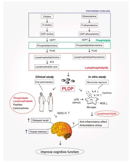 Accumulating evidence indicates that dementia is caused by damage to microglia–neuron communication []. Once activated, microglia can be potent immune effector cells that initiate both innate and adaptive immune responses and produce a number of cytokines, chemokines, and growth factors []. There has been increasing interest in the role of inflammation as a common mechanism of disease, including neurodegeneration. Common neurodegenerative diseases, including dementia, are associated with chronic neuroinflammation. This inflammation and subsequent tissue damage interfere with the ability of brain cells to communicate with each other. Signs and symptoms are linked to three stages of dementia: the early stage, middle stage, and late stage. A strong link has been observed between pro-inflammatory cytokines and neurodegeneration, both in clinical data and basic science research []. Recent evidence suggests that midlife risk factors for cardiovascular disease, including high cholesterol, hypertension, high homocysteine, and inflammation, are important risk factors for dementia in later years []. Furthermore, high cholesterol and hypertension have consistently displayed an association with increased risk of Alzheimer’s disease and vascular dementia []. Vascular pathology plays a key role in the development of vascular dementia in addition to Alzheimer’s disease []. An interesting report indicated that LPC and LPS attenuate the expression of inflammatory mediators in atherosclerosis []. Unfortunately, no treatment is currently available to cure dementia or to alter its progression. Numerous new treatments under investigation are in clinical trials. Currently, the principal goal of dementia care is early diagnosis, to promote early and optimal management. Although the exact mechanisms of action of PLDP are not fully understood, one possibility is a synergistic effect of phospholipid components in PLDP (Figure 1). Currently, LPC and LPE are the most attractive research targets in terms of biological activity and possible applications. Enzymatic digestion of LPC leads to the formation of various forms of bioactive lipids such as LPA and cPA, which are involved in modulating cardiovascular system physiology, wound healing, and carbohydrate metabolism, mediated by plasma membrane and nuclear receptors [,]. LPE is likely to have neuroprotective roles both in vivo and in vitro. We showed that media conditioned via exposure to LPE-treated microglia promoted morphological changes in a dose-dependent manner. Our study also indicated that LPC and LPE synergistically suppressed LPS-stimulated ROS production []. This finding is important given that microglia-mediated neuroinflammation is regarded as a pathological mechanism in many neurodegenerative diseases, such as dementia and Alzheimer’s disease, and a key event in accelerating cognitive or functional decline. Thus, lysophospholipids a promising therapeutic candidate for the treatment of age-related cognitive impairments, including neurodegenerative diseases, such as dementia (Figure 2). The effect of PLDP and its component phospholipids on other mental diseases will be an interesting topic to explore. We aimed to identify a functional phospholipid contained within PLDP that has been confirmed to have clinical effects and to develop a new drug for treating dementia and Alzheimer’s disease.