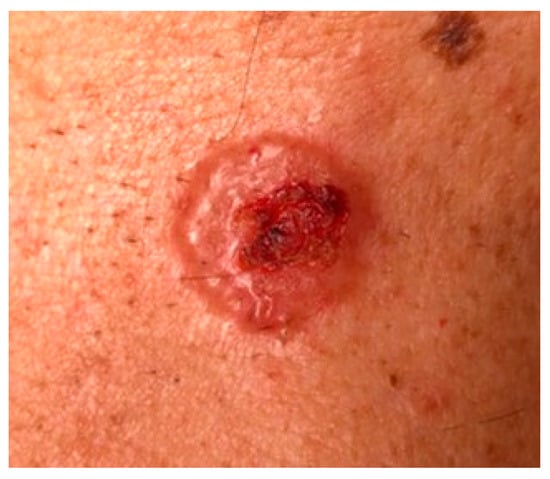 Nodular BCC (NBCC) is the most common clinical subtype, accounting for 50–79% of all BCCs [37,38]. NBCC appears as a papule or nodule with a characteristic pearly, shiny edge, and small arborizing telangiectasias (Figure 2). The lesion may ulcerate, but a sharp border usually is maintained, which can be a clue to the diagnosis [37]. NBCC involves most frequently the face, especially the cheeks, nasolabial folds, forehead, and eyelids. Several differential diagnoses should be considered, including molluscum contagiosum, sebaceous hyperplasia, amelanotic melanoma, trichoepithelioma, and Merkel cell carcinoma. Ulcerated lesions can be misdiagnosed for cSCC or keratoacanthoma.