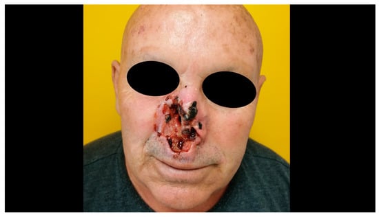Only 1% of BCC evolves in a giant BCC or in ulcus rodens, an extremely destructive form of BCC that shows deep tissue invasion and a high rate of postsurgical recurrence (Figure 5) [40]. Furthermore, combinations of these subtypes may be found in a single lesion, which is then referred to as a mixed tumor, that account for approximately 40% BCCs [41].