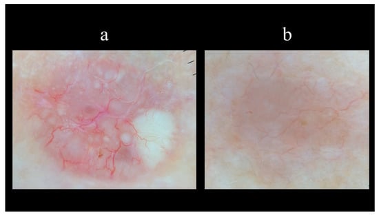 Dermoscopic features of (a) arborizing vessels in a 13 × 6 mm BCC, (b) short fine telangiectasias in a 8 × 4 mm BCC.