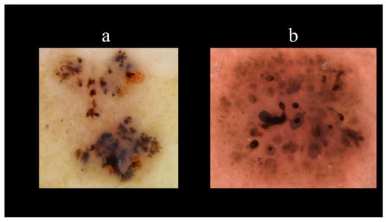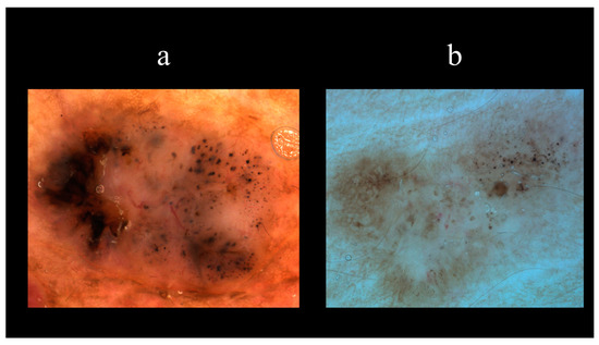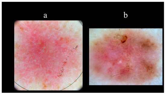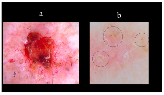 Starting from the dermoscopic vascular features, arborizing vessels are the main structures in BCC, with a high diagnostic accuracy and a positive predictive value of 94.1% [62,67,68,69]. Arborizing vessels consist of stem vessels of large diameter, characterized by a bright red color, branching irregularly into finest terminal capillaries (Figure 10a) [64,70,71]. Short fine telangiectasias are vessels with a small diameter and length of <1 mm, with few or no branches (Figure 10b) [70]. With regards to the pigmented-related structures, blue–grey ovoid nests are confluent or nearly confluent, well-circumscribed, pigmented ovoid, or elongated areas (Figure 11a) [61]. Maple leaf-like areas are bulbous extensions connected at a base area, usually brown or grey–blue in color, forming a leaf-like pattern (Figure 11b) [64,65]. Ulceration is a shallow erosion of the epidermis that reaches the dermis and may be covered with coagulated blood or serous crust (Figure 12a). Multiple small erosions are smaller compared to ulcerations, generally seen as small brown–red to brown–yellow crusts (Figure 12b) [65,70]. White–red structureless areas represent diffuse dermal fibrosis or fibrotic tumor stroma and appear as areas of white to red color (Figure 13a) [65,67,70]. White shiny streaks or chrysalis or crystalline structures can be seen only with polarized dermoscopy as orthogonal short and thick crossing lines and represent dermal fibrosis (Figure 13b) [72,73]. Multiple blue–grey dots and globules are numerous, loosely arranged round to oval well-circumscribed structures, smaller than blue–grey ovoid nests (Figure 14a). In-focus dots correspond to loosely arranged well-defined small grey dots, which appear sharply in focus (Figure 14b) [64]. Spoke-wheel areas are radial projections surrounding a central darker point, blue or grey color, rare in dermoscopy but highly specific for BCC (Figure 15a) [61,64]. Concentric structures are irregularly shaped globular-like structures with different colors, including blue, grey, brown, and black, with a darker central area, that could be variations or ‘precursors’ of the spoke wheel areas (Figure 15b) [64].