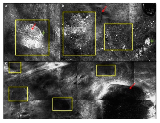(a) Reflectance confocal microscopy (RCM) image of a pigmented BCC (approximately 1.5 × 1.5 mm). At the level of superficial dermis we can see a bright tumor island (yellow rectangles), which resembles an elongated cord-like structures and that is well demarcated from surrounding dermis by cleft-like dark space (green star). Fine dendritic processes are visible within the tumor island with the typical peripheral palisading of nuclei (red arrow). (b) RCM image of a BCC (approximately 1.5 × 1 mm) at the superficial dermis level. Canalicular vessels are curved or linear structures very frequent in BCCs with small bright cells inside which correspond to leukocytes (red arrow). Tumor islands (in the yellow rectangles) with many dendritic and plump-bright cells. Dendritic cells are melanocytes while plump-bright cells that are oval to stellate bright cells without apparent nucleus, correlate with melanophages (green star). (c) RCM image of BCC (approximately 1.5 × 1 mm) at the superficial dermis level. It is possible to observe many dark silhouettes (yellow rectangles), which are tumor islands in nonpigmented BCCs, surrounded by thickened collagen. On the right hand side there is a dark oval area which corresponds to an ulceration (red arrow).