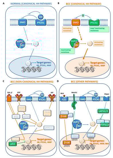 Most components of the HH pathway can function as tumor suppressor or proto-oncogenes, as mutations in their genes promote an oncogenic signaling and are associated with a wide variety of tumors, such as those of the brain, breast, gastrointestinal tract, lung, pancreas, prostate, ovary, and skin, including BCC [96,100] (Figure 17B).