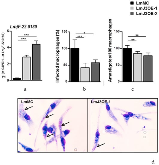 Features as a percentage of viable cells, metacyclogenesis efficiency, and metacyclic-specific cell size remained similar between LmJ3OE and LmMC parasites (data not shown). However, a significant decrease in the percentage of infected PEMs (Figure 1b,d) as well as in the number of amastigotes per infected cell (Figure 1c,d), was observed in both LmjF.22.0810 overexpressing strains with respect to the control strain at 6 h post-infection (Figure 1b–d).