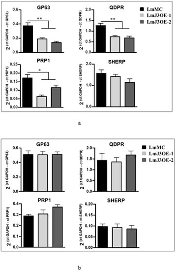 Expression profile of genes involved in the infectivity of LmjF.22.0810-overexpressing parasites compared to control. The mRNA expression levels of the zinc–metalloprotease GP63; quinonoid–dihydropteridine reductase (QDPR); the ATP-binding cassette transporter PRP1; and the small, hydrophilic, endoplasmic reticulum-associated protein (SHERP) were determined by qPCR in the (a) metacyclic promastigote and (b) amastigote forms of the three parasite strains, overexpressing (LmJ3OE-1 and LmJ3OE-2) or not overexpressing (LmMC) LmjF.22.0810 kinase. Bars represent the means (±SD) from three independent experiments (* p < 0.05, ** p < 0.01).