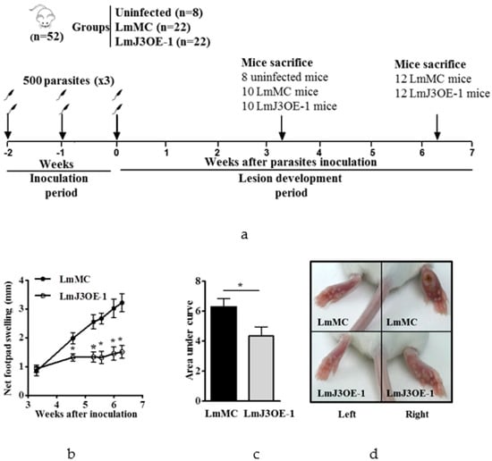 To evaluate the virulence of LmJ3OE parasites in vivo, we performed an infectivity assay in BALB/c mice. An implemented methodology allowing the development of a localized infection in the footpad that did not disseminate to internal organs was applied. This assay consisted of three low-dose inoculations of metacyclic parasites (500 parasites), overexpressing or not overexpressing LmjF.22.0810, administered subcutaneously once a week in the right hind footpad for three weeks (inoculation period) (Figure 3a). After this time, the footpad swelling was measured until the end of the experiment, 44 days from the last inoculation (lesion development period) (Figure 3a). A slight swelling began to be detected in some animals on day 23 after the last parasite inoculation. As illustrated in Figure 3b–d, LmJ3OE parasites’ infections caused a smaller lesion size compared to the mock control. Such differences were statistically significant from day 30 post-inoculation to the end of the experiment (Figure 3b).