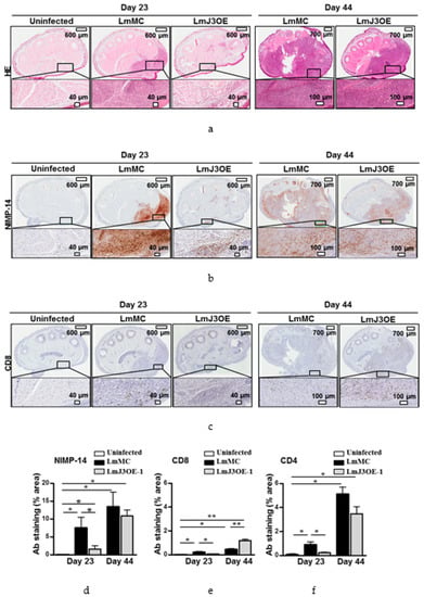 According to these data, hematoxylin–eosin footpad sections staining was also performed. This stain shows the general layout and distribution of cells and provides a general overview of a tissue sample structure. It showed a lower infiltrate area in LmJ3OE-infected mice compared to LmMC infected mice, both 23 and 44 days post-inoculation with L. major (Figure 4a). Neutrophils (NIMP-14) were one of the cell types present in the infiltrate area (Figure 4b,d). The study of T lymphocyte (CD8 and CD4) infiltration revealed a smaller area stained in the footpad sections from LmJ3OE-infected mice compared to LmMC-infected mice at day 23 post-inoculation with L. major (Figure 4c,e,f). However, at day 44 post-infection with L. major, the number of CD8 lymphocytes was significantly higher in LmJ3OE-infected mice compared to LmMC-infected mice, while the number of CD4 lymphocytes was similar between LmJ3OE and LmMC (Figure 4c,e,f).