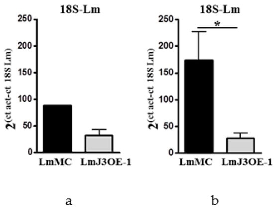 In this paper, after generating L. major cells overexpressing the conserved and putatively essential protein kinase LmjF.22.0810, we assessed the rate of infectivity of LmJ3OE parasites in PEM obtained from BALB/c mice. For that purpose, PEMs were infected with LmJ3OE or LmMC PNA(-) metacyclic promastigotes, and 6 h later, the number of infected PEMs and the parasites per cell were determined under a light microscope. Assays were performed with two different strains of LmJ3OE parasites (overexpressing LmjF.22.0810) and one of LmMC (as control with normal expression of LmjF.22.0810). Figure 1a shows the expression levels of LmjF.22.0810 in the three L. major strains (LmMC, LmJ3OE-1, and LmJ3OE-2). LmJ3OE strains showed significantly higher expression levels of LmjF.22.0810 when compared to control parasites. In fact, LmJ3OE-1 and LmJ3OE-2 exhibited 11.65 ± 3.44- and 18.14 ± 6.72-fold changes, respectively (Figure 1a).