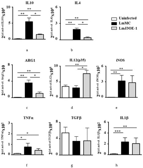 Immune-related gene expression profiles 23 days after inoculation period. mRNA levels from footpad lesions were analyzed by qPCR to study the immunomodulatory role of molecules (a) interleukin (IL)-10, (b) IL-4, (c) arginase (ARG)1, (d) IL-12 (p35), (e) inducible NO synthase (iNOS), (f) tumor necrosis factor (TNF)-α, (g) transforming growth factor (TGF)-β, and (h) IL-1β. The analysis was performed on day 23 after inoculation with both L. major overexpressing LmjF.22.0810 (LmJ3OE-1) and L. major control (LmMC) strains. Bars represent the means (±SD) (* p < 0.05, ** p < 0.01, *** p < 0.001).