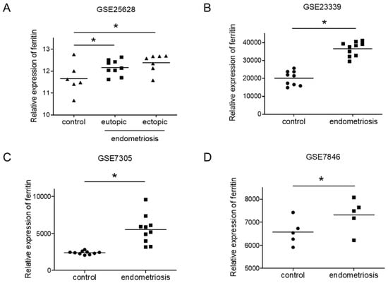 Expression of ferritin in endometriotic tissues. Ferritin expression was evaluated using four GEO datasets: GSE25628 (A), GSE23339 (B), GSE7305 (C) and GSE7846 (D). The values represent the mean ± SD of results. * p < 0.05.