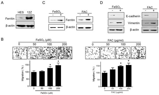 Effect of iron on migration in human endometriotic cells. (A) The protein expression of ferritin was investigated by Western blot analysis in human endometrial HES and endometriotic 12Z cells. (B) 12Z cells were treated with iron (FeSO4: 50, 100, and 200 µM; FAC: 50, 100, and 200 µg/mL). The cells were allowed to migrate for 24 h. Transwell migration assay was performed. Values represent the means ± SD of three independent experiments. * p < 0.05 as compared with control. (C,D) 12Z cells were treated with iron (FeSO4: 100 µM; FAC: 100 µg/mL) for 24 h. The protein expressions of ferritin, E-cadherin, and vimentin were determined by Western blot analysis. β-Actin was used as a loading control. Representative images of three independent experiments are shown.