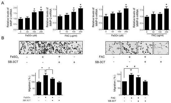 Effect of iron on MMP expression in human endometriotic cells. Human endometriotic 12Z cells were treated with iron (FeSO4: 50, 100, and 200 µM; FAC: 50, 100, and 200 µg/mL) for 24 h. (A) Real-time RT-PCR was performed to measure the mRNA levels of MMP-2 and MMP-9 in 12Z cells. (B) 12Z cells were treated with iron (FeSO4: 100 µM, FAC: 100 µg/mL) for 24 h in the presence of 10 µM of SB-3CT, a gelatinase (MMP-2 and MMP-9) inhibitor. Transwell migration assay was performed. Representative images of three independent experiments are shown. Values represent the means ± SDs of three independent experiments. * p < 0.05 as compared the control group; # p < 0.05 as compared the treated group.