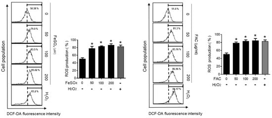 Effect of iron on the levels of intracellular ROS in human endometriotic cells. Human endometriotic 12Z cells were treated with iron (FeSO4: 50, 100, and 200 µM; FAC: 50, 100, and 200 µg/mL) for 24 h. Intracellular levels of ROS were determined by fluorescence-sensitive probe DCF-DA assays. H2O2 (50 µM) was used as a positive control. The values represent the mean ± SD of results from three independent experiments. * p < 0.05 as compared with control.