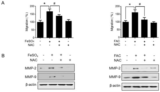 ROS play an important role in many physiological conditions along with pathological conditions, such as endometriosis [33,34]. Thus, we examined the effect of iron overload on the intracellular levels of ROS using a fluorescence-sensitive probe, DCF-DA. The ROS levels were significantly increased by FeSO4 and FAC treatment in 12Z cells (Figure 4). In addition, the antioxidant N-acetyl-L-cysteine (NAC) significantly suppressed the iron-stimulated migration of endometriotic 12Z cells (Figure 5A). Moreover, the iron-induced MMP-2/-9 expression was significantly suppressed by NAC treatment in 12Z cells (Figure 5B). These results suggest that iron-induced ROS may promote endometriosis progression.