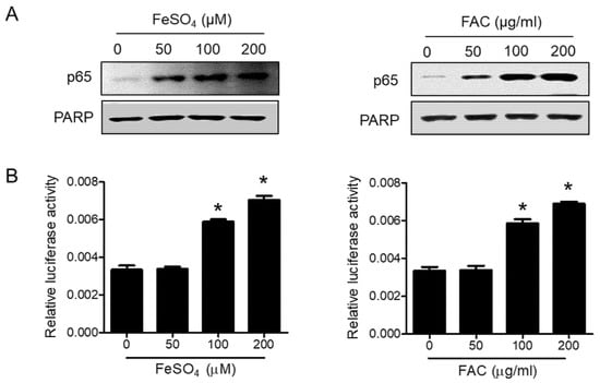 Effect of iron on the NFĸB pathway in human endometriotic cells. (A) Human endometriotic 12Z cells were treated with iron for 24 h. The nuclear expression of p65 was determined by Western blot analysis. PARP was used as a nuclear protein loading control. (B) 12Z cells were transiently transfected with pNFκB-Luc vector and then treated with iron for 6 h. Luciferase assay was performed. Representative images of three independent experiments are shown. Values represent the means ± SDs of three independent experiments. * p < 0.05 as compared with control.