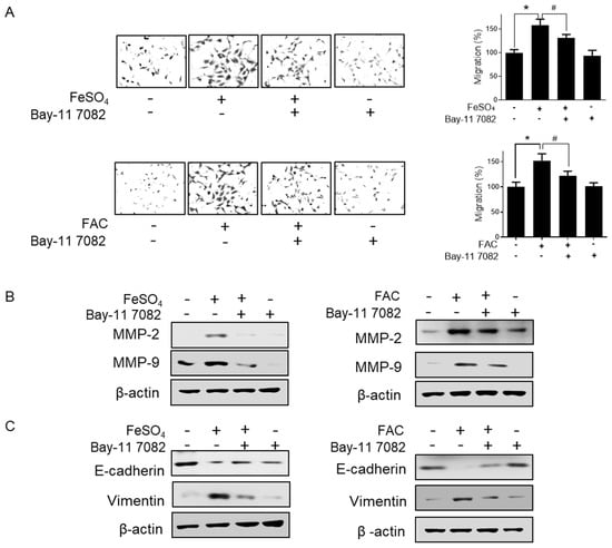 Effect of NFĸB inhibitor on iron-induced migration in human endometriotic cells. Human endometriotic 12Z cells were treated with iron (FeSO4: 100 µM; FAC: 100 µg/mL) in the presence of Bay 11-7082 (1 µM) for 24 h. (A) Transwell migration assay was performed. (B) MMP-2 and MMP-9 expressions were determined by Western blot analysis. (C) E-cadherin and vimentin expressions were determined by Western blot analysis. β-Actin was used as a loading control. Representative images of three independent experiments are shown. The values represent the mean ± SD of the results from three independent experiments. * p < 0.05 as compared to the control group; # p < 0.05 as compared to the treated group.