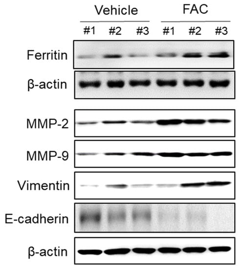 Effect of iron on EMT and MMP-2/-9 expression in endometriotic lesions of mouse model. Female BALB/c mice were intraperitoneally administered with vehicle (0.05% CMC) and FAC (75 mg/kg) three times per week for 5 weeks. The endometriotic lesion tissue on peritoneum was lysed and the protein expressions of ferritin, MMP-2, MMP-9, vimentin, and E-cadherin were determined by Western blot analysis. β-Actin was used as a loading control. Each mouse tissue of the vehicle and FAC groups was marked with a number (#1–3).