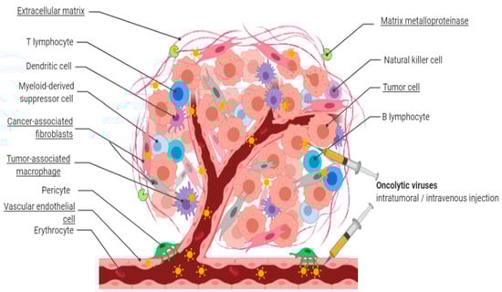 Simultaneous tumor and stroma targeting upon in situ oncolytic virus administration. In situ administration of natural, bioselected, or genetically engineered oncolytic viruses (OVs) results in targeting of tumor cells as well as stroma components, including heterogeneous cancer-associated fibroblasts, extracellular matrix, tumor vasculature, and tumor-associated macrophages. As a result, OV penetration and replication are increased, leading to enhanced tumor killing and anti-tumoral immune activity.