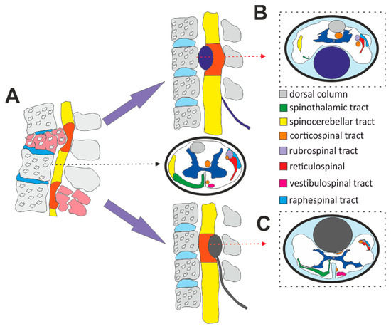 As stated above, dorsal displacement of the vertebral body fragments and herniated injured intervertebral disc, compress the anterior surface of the cord causing anterior spinal cord syndrome (Figure 1A,B), which represents around 1–3% of all traumatic SCI [34,35]. However, 50% has also been described [36]. Of the different spinal cord syndromes, anterior cord syndrome has the worst prognosis. Spinal cord infarction, or anterior epidural hematoma, are other, nontraumatic causes [37]. A compressed spinal cord results in the loss of white and gray matter and the formation of surrounded by arachnoiditis and astrogliosis, which interfere in the later stage with axonal regeneration [38]. In a rat spinal cord, localization of the main axonal tracts slightly differs from that in humans. Lesions of the ventrally localized spinothalamic tract induce neuropathic pain, injury of the ventral part of corticospinal tract, impaired locomotor ability and vulnerability of the motor neurons in the ventral horn. As far as we are aware, only a few rat models of ventral spinal cord injury using the sharp blade [39], hypodermic needle [40], inflatable gel [41] or aneurysm compression clip [42] have been proposed. A model with a ventrally placed screw into the cervical vertebra was also introduced to simulate chronic compressive myelopathy in larger animals (cats, dogs) [43,44]. In rat models, methods using progressive compression by a screw or expanding gel have also been developed [45,46]. However, unlike the localized injury induced by clip compression or sharp hemisection, an expanding balloon in the spinal canal spreads the compression force across all laminae of the spinal cord and thus, realistically, simulates the common human SCI.