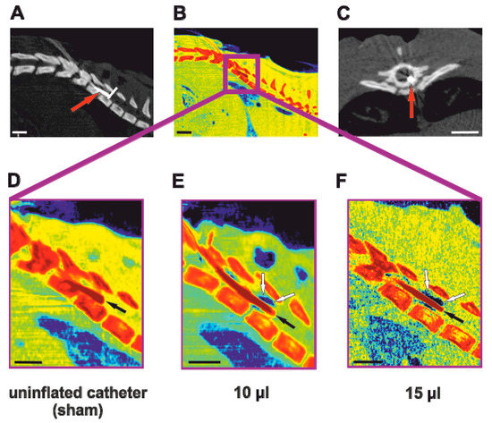 Micro computed tomography (CT) images of ventral epidural catheter placement. In order to evaluate the position of the catheter (red arrows) in front of the spinal cord, micro CT with bone window (A,C) and soft tissue window (B) were applied. Furthermore, detailed images of the deflated balloon (D), as well as inflated to 10 µL (E) and 15 µL (F) volume balloon were obtained. Black arrows show the wire of the catheter, whereas white arrows point to the imaged saline solution indicating the amount of inflated Fogarty´s balloon. Scale bar: 2 mm.