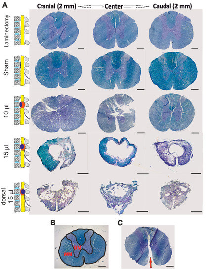 Histological and immunohistochemical assessment of obtained cross sections. Graded spinal cord lesion in and around the epicentre (spinal level Th8) correlated with the level of compression (A). Morphometry of the white and grey matter according to the histological images was performed in an area of 7 mm cranially and caudally to the lesion centre (B). In the group of 10 μL, splitting of the anterior median fissure was observed—red arrow points towards the split anterior median fissure (C). Scale bar: 500 μm.