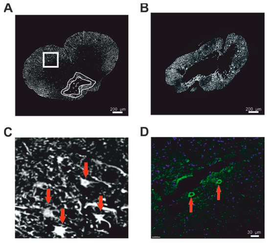 Immunohistochemical visualization of the astrogliosis and protoplasmic astrocytes was obtained by staining with CY3-conjugated primary antibody against GFAP (1:400, Sigma-Aldrich, St. Louis, MO, USA) (Figure 4A,B). From each group, five animals were obtained. A total number of ten cross-sections, including the center of the lesion and areas both cranially and caudally, were observed and photographed with an Axioskop 2 plus microscope (Zeiss, Oberkochen, Germany). Acquired images were evaluated for the total area of GFAP high intensity signal around the malatic cavity representing the astrogliosis by ImageJ software (NIH, Bethesda, MD, USA). On the same images, the total number of protoplasmic astrocytes was manually counted (Figure 4C).