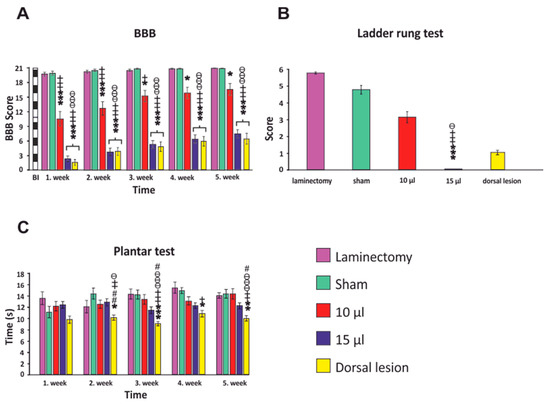 Behavioral assessment of the SCI rats. BBB open field test revealed significant differences between groups. The inflated balloon with 15 µL both ventrally and dorsally resulted in severe paraparesis with only mild improvement (A). Ladder rung score at the fifth week showed a reduced performance in both lesioned groups, where animals in the 15 µL group were unable to cross the ladder (B). Evaluation of the plantar test indicated significant hyperalgesia in the group with the dorsal lesion (C). For statistical details, see Tables S1–S3 in the Supplementary Material. Data are expressed as mean ± SEM. * p < 0.05 versus laminectomy; ** p < 0.01 versus laminectomy; *** p < 0.001 versus laminectomy; + p < 0.05 versus sham; ++ p < 0.01 versus sham; +++ p < 0.001 versus sham; ϴ p < 0.05 versus 10 µL; ϴϴ p < 0.01 versus 10 µL; ϴϴϴ p < 0.001 versus 10 µL; # p < 0.05 versus 15 µL.