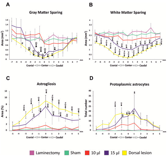 The absolute number of protoplasmic astrocytes (PA) around the astrogliosis was counted in the same GFAP-positive immunohistochemical axial slices. In the uninjured groups, sporadic PAs were found. Elevated numbers of PAs were found in both the 10 µL and 15 µL groups. In the 15 µL group, there was a significantly higher number of astrocytes with the peak appearance around the center of the lesion. The dorsal lesion groups achieved similar results to the 15 µL group (Figure 6D).