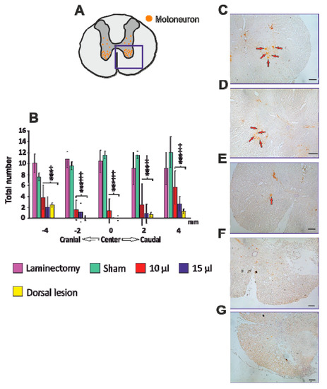 Immunohistochemical assessment of motoneurons. Total number of motoneurons localized in the ventral horn was counted on axial slices around the center of the lesion (A). Total number of motoneurons was significantly decreased in both ventrally injured groups and in dorsal SCI across the lesioned area (B). Representative immunohistochemical images with visible motoneurons (red arrows) from each group are shown (C—laminectomy, D—sham, E—10 μL, F—15 μL, G—dorsal 15 μL). For statistical details, see Table S8 in the Supplementaty Material. Scale bar: 200 μm.Data are expressed as mean ± SEM. * p < 0.05 versus laminectomy; ** p < 0.01 versus laminectomy; *** p < 0.001 versus laminectomy; + p < 0.05 versus sham; ++ p < 0.01 versus sham; +++ p < 0.001 versus sham