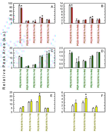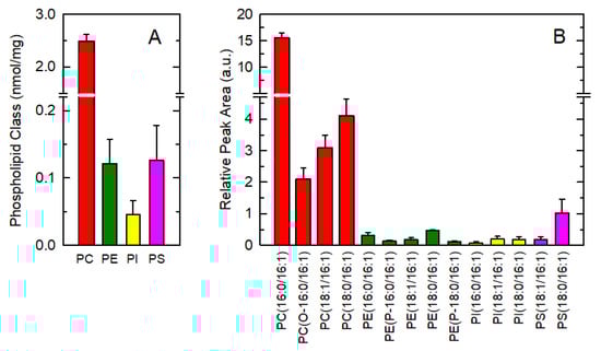 Lipids corresponding to 50 µg of cell homogenate protein were extracted according Bligh and Dyer []. The samples were re-dissolved in hexanes/2-propanol/water (42:56:2, v/v/v) and injected into a Thermo Fisher Scientific Dionex Ultimate 3000 high-performance liquid chromatograph equipped with an Ultimate HPG-3400SD standard binary pump and an Ultimate ACC-3000 autosampler column compartment (Thermo Fisher Scientific, Waltham, MA, USA). Separation was carried using a FORTIS HILIC column (150 mm × 3 mm, 3 µm particle size) (Fortis Technologies, Neston, UK). The mobile phase consisted of a gradient of solvent A (hexanes/isopropanol 30:40, v/v) and solvent B (hexanes/isopropanol/20 mM ammonium acetate in water, 30:40:7, v/v/v). The gradient started at 75% A from 0 to 5 min, then decreased from 75% A to 40% A at 15 min, from 40% A to 5% A at 20 min, was held at 5% until 40 min, and then increased to 75% at 41 min. Then, the column was re-equilibrated holding 75% A for an additional 14 min period before the next sample injection []. The flow rate through the column was fixed at 0.4 mL/min. The liquid chromatography system was coupled online to an Sciex QTRAP 4500 mass spectrometer equipped with a Turbo V Ion Source and a TurbolonSpray probe for electrospray ionization (AB Sciex, Framingham, MA, USA). Source parameters were set as follows: ion spray voltage, −4500 V; curtain gas, 30 psi; nebulizer gas, 50 psi; desolvation gas, 60 psi; temperature, 425 °C. Phospholipid species were analyzed in scheduled multiple reaction monitoring mode with negative ionization, detecting in Q3 the m/z of 253.2, corresponding to 16:1 fatty acids, as [M-H]−. The chromatographic peaks of each species were integrated and normalized to the peak area of the internal standard corresponding to each phospholipid class.
