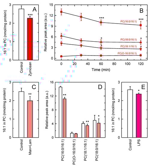 Effect of macrophage activation on the cellular levels of 16:1-containing PC. (A) The cells were either untreated (control) or stimulated with 1 mg/mL zymosan for 1 h. Afterward, the content of 16:1 fatty acid in PC was determined. These results are shown as means ± standard error (n = 6). *** p < 0.001, significance of zymosan-stimulated cells versus control cells. (B) Time-course of the effect of zymosan on the levels of 16:1-containing PC species. Results are shown as means ± standard error (n = 6). *** p < 0.001 or * p < 0.05, significance of zymosan-stimulated cells at the indicated times versus unstimulated conditions (zero time). (C) The cells were either untreated (control) or stimulated with 0.5 mg/mL mannan (Man) plus 0.5 mg/mL laminarin (Lam) for 1 h. Afterward, the content of 16:1 fatty acid in PC was determined. Results are shown as means ± standard error (n = 6). ** p < 0.01, significance of Man and Lam-stimulated cells versus control cells. (D) The different 16:1-containing PC species were measured in unstimulated cells (open bars) or cells stimulated with 0.5 mannan plus 0.5 mg/mL laminarin (red bars) for 1 h. Results are shown as means ± standard error (n = 6). ** p < 0.01 or * p < 0.05, significance of Man and Lam-stimulated cells versus control cells within each species. (E) Raw cells were either untreated (control) or stimulated with 200 ng/mL bacterial lipopolysaccharide (LPS) for 6 h. Afterward, the content of 16:1 fatty acid in PC was determined. Results are shown as means ± standard error (n = 6). * p < 0.05, significance of LPS-stimulated cells versus control cells.