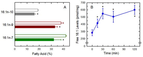 In previous work from our laboratory, we showed that at least three 16:1 fatty acid positional isomers co-exist at significant levels in macrophages and other innate immune cells, namely 16:1n-7 (cis-9-hexadecenoic acid; palmitoleic acid), 16:1n-9 (cis-7-hexadecenoic acid; hypogeic acid), and 16:1n-10 (cis-6-hexadecenoic acid; sapienic acid), and that the three of them exhibit anti-inflammatory activity to different degrees [,]. It was therefore important to assess whether or not the three isomers are differentially released upon zymosan activation of the cells. Figure 3A shows that stimulated macrophages exhibited decreased amounts of all three isomers, suggesting that whatever may be the pathway for 16:1 mobilization, it does not distinguish the position of the double bond. In an analogous manner to arachidonic-acid containing phospholipids, the decreases of which after cellular stimulation are the result of increased free arachidonic acid release [,,], we reasoned that the decrease in cellular 16:1-containing phospholipids is due to the release of 16:1 fatty acids during activation. As shown in Figure 3B, this was found to be the case, and a time-dependent increase in free 16:1 fatty acid formation could be detected after activation of the macrophages. At 1 h, 16:1 release had increased two-fold over unstimulated levels, which represents 10–15% of total fatty acid initially present in the cells.