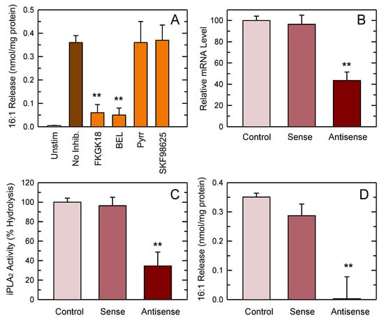 To confirm the results obtained with inhibitors, we next examined the effect of an iPLA2-VIA antisense oligonucleotide, which we and others have previously used with success to reduce the expression of this enzyme in a variety of cells [,,,,,]. Since we were unable to find reliable antibodies against murine iPLA2-VIA, the efficiency of antisense inhibition was analyzed by determining mRNA levels by qPCR, and also by assaying the BEL-inhibitable iPLA2 activity of cell homogenates after the different treatments. Using these techniques, we observed an mRNA decrease of 50–60% (Figure 4B), and an enzyme activity decrease of 60–70% (Figure 4C). Notably, even with this incomplete inhibition, the stimulus-induced mobilization of 16:1 fatty acids from the macrophages was almost completely abrogated (Figure 4D). Collectively, these data strongly suggest that iPLA2-VIA is the key enzyme regulating 16:1 fatty acid mobilization in activated macrophages.