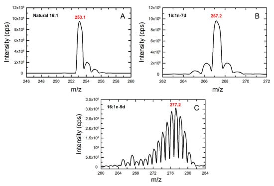 Figure 5 shows the characteristic profile of natural 16:1, deuterated 16:1n-7 (16:1n-7d) and deuterated 16:1n-9 (16:1n-9d). Deuterated 16:1n-10 was not available at the time of carrying out these experiments. 16:1n-7d was obtained from commercial sources and contained 14 deuterium atoms; thus, it produced a bell-shaped set of peaks due to the presence of various isotopomers with a maximum at m/z 267, corresponding to the m/z of the native molecule plus 14 deuteriums. 16:1n-9d was synthesized in our laboratory and contained 27 deuterium atoms (all hydrogen atoms bound to saturated carbons); thus, it produced a bell-shaped set of peaks with a maximum at m/z 277, that is, the m/z of native 16:1 plus 27. The signal produced by native 16:1 was very different, showing a decay from a maximum at m/z 253, allowing clear differentiation.