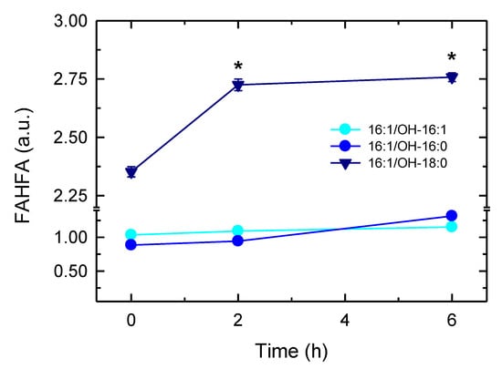 Identification of 16:1-derived branched fatty acid esters of hydroxy fatty acids (FAHFAs). The cells were stimulated with mannan plus laminarin (0.5 mg/mL each) for the indicated times. Then, 16:1-containing FAHFAs were determined by LC/MS. Three species were detected: hydroxyhexadecenoic acid (16:1/OH-16:1) (cyan), hydroxypalmitic acid (16:1/OH-16:0) (blue) and hydroxystearic acid (16:1/OH-18:0) (dark blue). A representative experiment is shown, and the data are expressed as mean values ± of three individual replicates. * p < 0.05, significantly different from unstimulated cells.