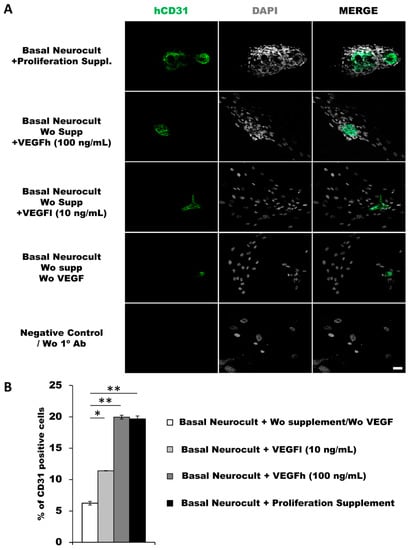 hDPSCs grown in Neurocult proliferation and basal media supplemented with VEGF165 show endothelial differentiation capacity under adherent conditions (A) Representative immunofluorescence images for CD31 endothelial marker of previously selected cell culture conditions. Gray color; DAPI. Green; CD31. Scale bar = 100 µm. (B) Quantification of CD31 relative positive cell percentage for each culture condition at 7DIV (n = 3). Means in % and standard error of the mean (SEM±) are shown. *: p < 0.05; **: p < 0.01. Kruskal-Wallis with Dunn’s post hoc test.