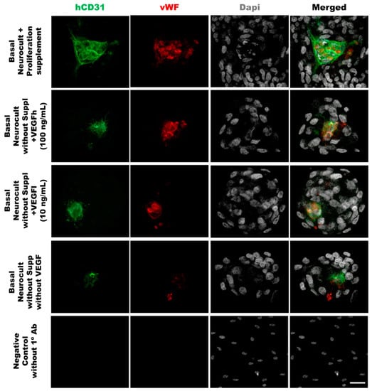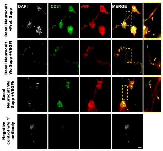 As another confirmation of the results obtained by flow cytometry, we decided to assess endothelial marker expression by immunocytochemistry (ICC) on laminin-coated coverslips. hDPSCs seeded under these adherent conditions in all of the different culture media showed CD31+ endothelial cells (Figure 3A). Data for immunofluorescence showed a significantly higher percentage of positive CD31+ cells after 7DIV in hDPSCs cultures grown in either standard Neurocult proliferation (19.66 ± 0.48%) or basal Neurocult with VEGFh (19.96 ± 0.29%), compared to VEGFl, (11.39 ± 0.03%) and hDPSCs cultured in plain basal Neurocult™ with no proliferation supplement nor VEGF-A165. (6.23 ± 0.28%) (Figure 3B). Furthermore, a complementary staining against vWF endothelial marker, co-labeled CD31/vWF+ cells in all the studied conditions (Figure 4).