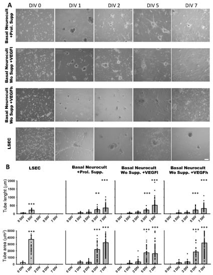 The formation of capilar-like tubular structures in Matrigel™ is one of the most widely used techniques to assess and quantify angiogenesis capacity in vitro. We assessed the ability of DPSC-derived endothelial cells to create 3D vascular tubules on Matrigel during 7DIV cultures (Figure 5A). We selected the timepoint of best tubule formation and stability for morphometric analysis. On dissociated hDPSC cultures, the commercial Proliferation supplement™, VEGFh and VEGFl were added to Neurocult™ NSA basal medium. We previously demonstrated that these three culture media were able to provide dentospheres containing CD31+ cell populations. Endothelial cells derived from hDPSCs cultured in Neurocult™ proliferation supplement gave rise to capilar-like structures as early as after 24 h of culture: tube length 76.76 ± 08.87 µm, 96.91 ± 7.71 µm, 250.25 ± 17.13 µm and 358.16 ± 14.26 µm for 1, 2, 5 and 7 DIV, respectively, (p < 0.05 and p < 0.001 for 5DIV and 7DIV respectively, one-way ANOVA). The tube area was 313.33 ± 36.42 µm2, 275.86 ± 25.44 µm2, 2251.21 ± 226.58 µm2 and 3210.14 ± 151.80 µm2 for 1, 2, 5 and 7 DIV, respectively (p < 0.001 for 5 and 7DIV, one-way ANOVA). For hDPSCs grown with Neurocult with VEGFh, the values for the tube length were: 63.12 ± 9.84 µm, 90.93 ± 5.16 µm, 230.23 ± 23.26 µm and 322.82 ± 14.84 µm for 1, 2, 5 and 7 DIV, respectively (p < 0.001 for 5 and 7DIV, one-way ANOVA; Figure 5B). The tube area was 208.65 ± 47.37 µm2, 367.77 ± 58.10 µm2, 2079.81 ± 272.01 µm2 and 3180.48 ± 386.03 µm2 for 1, 2, 5 and 7 DIV, respectively (p < 0.001 for 5 and 7DIV, one-way ANOVA). Interestingly, VEGFl also showed a similar tubulogenesis rate over time as the rest of the conditions: tube length 50.29 ± 03.05 µm, 103.19 ± 06.56 µm, 232.25 ± 17.21 µm and 521.55 ± 35.91 µm for 1, 2, 5 and 7 DIV, respectively (p < 0.001 for 5 and 7DIV, one-way ANOVA). The tube area was 138.42 ± 21.34 µm2, 309.15 ± 36.90 µm2, 1792.81 ± 205.77 µm2 and 1788.65 ± 193.69 µm2 for 1, 2, 5 and 7 DIV, respectively (p < 0.001 for 5 and 7DIV, one-way ANOVA, Figure 5B). Liver sinusoidal endothelial cells (LSECs) were used as an endothelial cell positive control and we performed parallel assays using LSECs (Figure 5A). LSECs generated tubules much faster than hDPSCs in the short term, attaining maximal tubulogenesis at 1DIV with an average tube length of 58.27 ± 7.82 µm and 222.56 ± 13.80 µm for 0 and 1DIV, respectively (p < 0.001 one-way ANOVA) and tube area of 256.05 ± 72.00 µm and 3704.90 ± 618.60 µm for 0 and 1DIV, respectively (p < 0.001 one-way ANOVA). However, the fast growth of LSEC capilar-like structures was not sustained from 2DIV onwards because cells rapidly lost their viability. In conclusion, the quantified tubulogenesis parameters of hDPSCs achieved at 5 and 7DIV were comparable to those of 1DIV for LSECs.