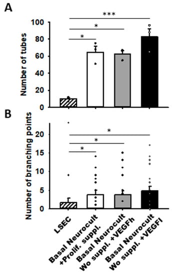 Remarkably, we observed that hDPSCs grown either with proliferation supplement or with both h/L doses of VEGF at 5DIV created more capilar-like structures than those observed for LSECs seeded at a comparable density: 64.66 ± 7.12 tubes/mm2 in DPSCs cultured with Neurocult proliferation supplement, 62.66 ± 3.84 tubes/mm2 for Neurocult with VEGFh, and 83.00 ± 9.29 tubes/mm2 for Neurocult with VEGFl compared to barely 10.00 ± 1.52 tubes/mm2 observed for LSECs (p < 0.05 and p < 0.001 Kruskal-Wallis, Figure 6A). Next, we measured the interconnections or branching points of the tubes and we found an average of 3.80 ± 1.09 branches/mm2 for Neurocult with proliferation supplement, 3.70 ± 1.14 branches/mm2 for Neurocult with VEGFh, and 4.75 ± 1.22 branches/mm2 for Neurocult with VEGFl compared to 1.60 ± 1.21 branches/mm2 for LSEC (p < 0.05 one-way ANOVA, Figure 6B).