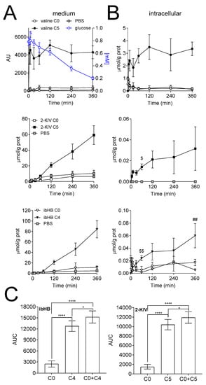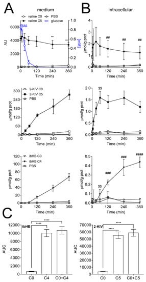 p < 0.0001) between the AUC of secreted ibHB C0 and C4, and 2-KIV C0 and C5 was observed. In particular the AUC was 2478 ± 817, 12,759 ± 1436 and 15,238 ± 1653 for the C0, C4 and C0+C4 labeling counterparts of ibHB, respectively, corresponding to a labeled/[unlabeled + labeled] ratio of 84 ± 16% (