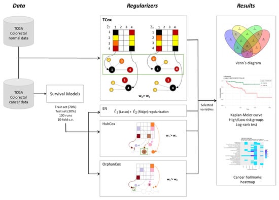 Finally, it is noteworthy that all the novel regularizers—either those favoring or penalizing the selection of hubs (HubCox and OrphanCox) or promoting the genes with distinct correlation patterns in tumor and normal tissue samples (TCox)—added valuable information to the results obtained by the Elastic Net only. Indeed, by significantly expanding the resulting gene sets, TCox generated hypotheses regarding putative targets that may be further tested and experimentally analyzed.