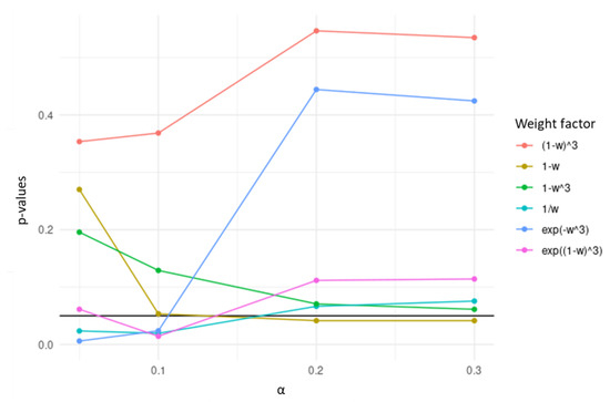 p-values obtained in the separation of high- and low-risk survival curves based on the genes selected by TCox models generated with transformations of w using colorectal RNA-seq data, tested over different values.