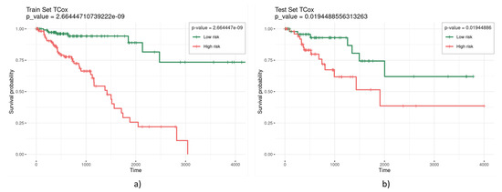 Kaplan–Meier curves obtained from the (a) training and (b) test sets, based on the variables selected by the TCox model with .