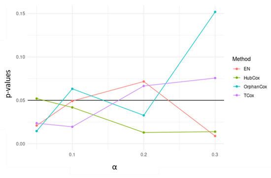 The survival analysis was performed using four models: EN, HubCox, OrphanCox, and TCox. All models were estimated from 100 randomly generated runs with for both the training and the test sets. Among the 100 runs tested, only a few were statistically significant (Table 1), and none yielded significant results for the four methods simultaneously in the test set. The results presented hereafter were obtained using the run that showed statistically significant results for the test set in three models: TCox, HubCox, and EN. Afterwards, to analyze the level of sparsity of the models using the same partition obtained earlier, the parameter was set between and , which provides a feasible number of features to be further analyzed. To evaluate the performance of the models, the observations were split into two groups defined by the median of the fitted relative risks. This procedure allows performing the log-rank test via the Kaplan–Meier estimator and assessing if the two groups’ mortality is the same by evaluating the corresponding p-values. The selected variables using were compared between models and queried in the CHAT (Cancer Hallmarks Analytics Tool [33]) to assess the association between the selected genes and cancer hallmarks based on previous studies.