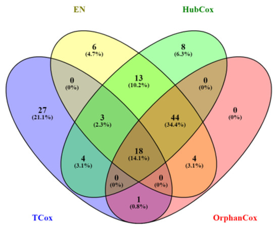Venn diagram representing the number of genes selected by EN (yellow), HubCox (green), OrphanCox (red), and TCox (blue) using .
