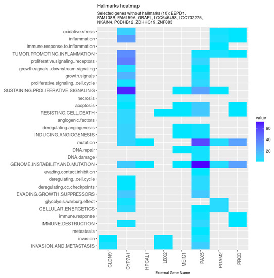 Genes selected by the TCox method associated with the hallmarks of cancer, given by the CHAT. The value corresponds to the number of hits found in the literature, where light and dark blue correspond to a low and high number of hits, respectively.