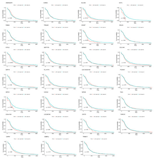 Nevertheless, specific genes were selected only by HubCox (8 genes), EN (6 genes), and TCox (27 genes), most of them with associations with the cancer hallmarks (Figure 7 and Figure 8). TCox was the model that identified the highest number of genes (Table 4); among them, eleven genes were associated with the hallmarks of cancer. In particular, the RAB20, FCRL2, COL12A1, DCP1A, and OSBPL3 genes were previously shown to have prognostic value in cancer. In addition, pseudogenes (such as ANKRD26P1, AOX2P, and SEPTIN7P2) and genes involved in the integrity of the extracellular matrix (COL19A1), cellular adhesion (IGLON5, PCDHA7), the mitochondrial respiratory chain (COX4I2), telomere function (TERF2IP), E3 ubiquitination (TRIM67), and the export of nuclear RNA (NXF2B) suggested important roles in CRC development that should be further investigated. After analyzing each gene independently, we observed that most of the genes were not significantly associated with survival (Figure 9).