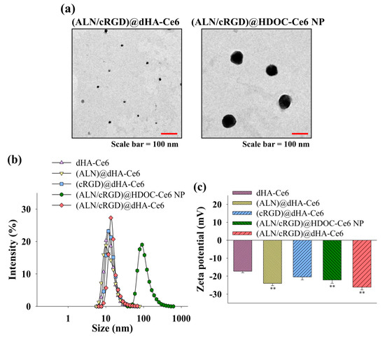 Figure 2c shows that the zeta potential of all samples was negative at pH 7.4, owing to the presence of the negatively charged HA and Ce6 [50,51]. Especially, (ALN)@dHA-Ce6, (ALN/cRGD)@HDOC-Ce6 NP, and (ALN/cRGD)@dHA-Ce6 have a very reduced zeta potential value owing to the presence of rich phosphoryl groups of ALN [52,53].